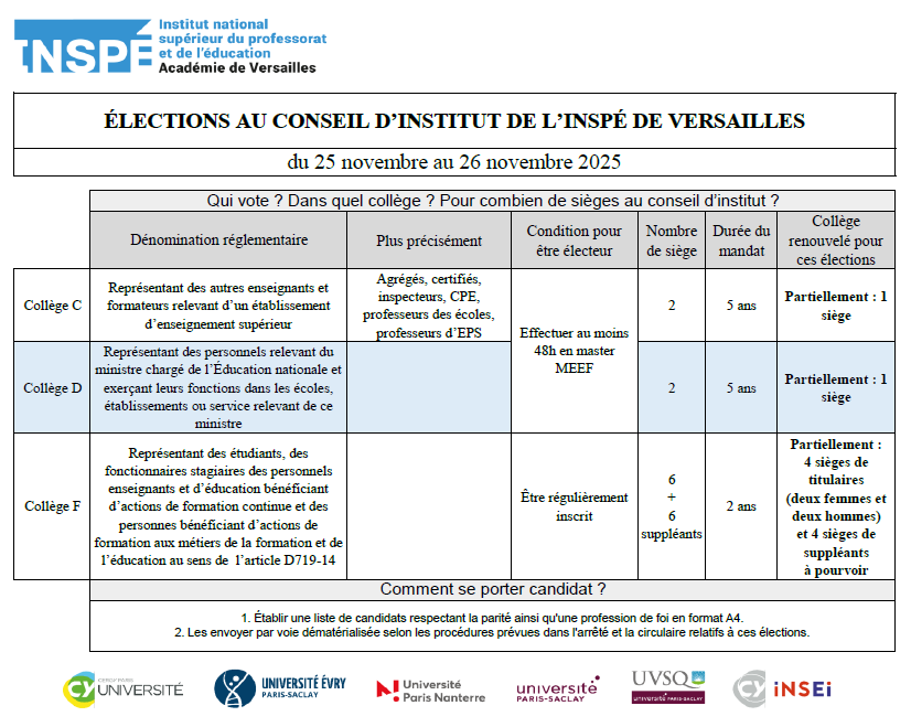L’INSPÉ de l’académie de Versailles organise des élections afin de renouveler le conseil d’institut les mardi 25 et mercredi 26 novembre 2025 : collèges C et D des personnels et F des usagers.