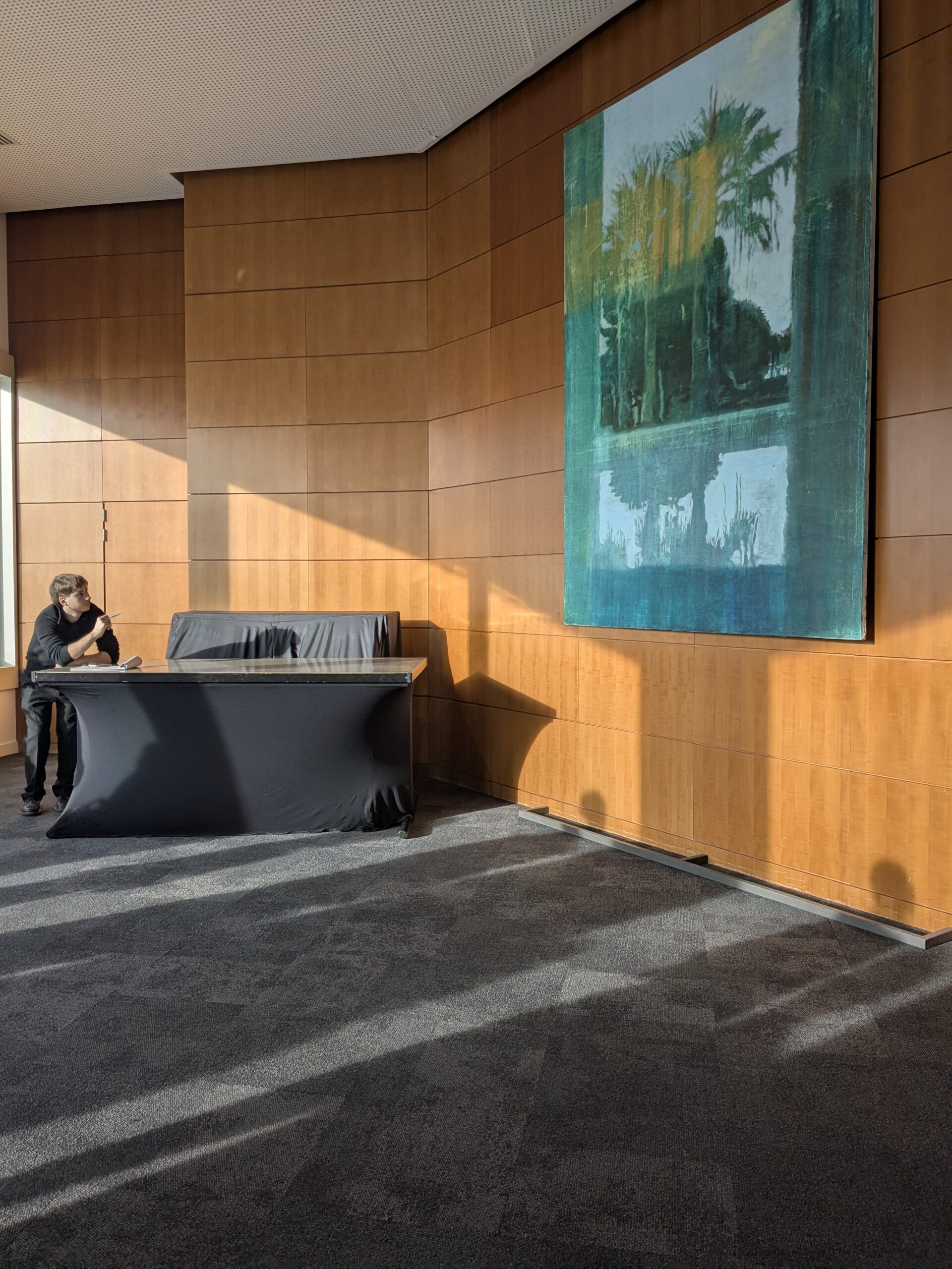 Parallèlement, les guides de la collection d’art contemporain ont amenés les étudiants à se questionner sur le fait d’exposer dans un environnement a priori incompatible : un immeuble de bureaux, des salles de réunions, le secteur tertiaire. Elles ont également évoqué le nécessaire accompagnement à la lecture de l’art contemporain, par exemple en amenant les publics à prendre de la distance par rapport aux émotions pouvant être ressenties par les spectateurs.