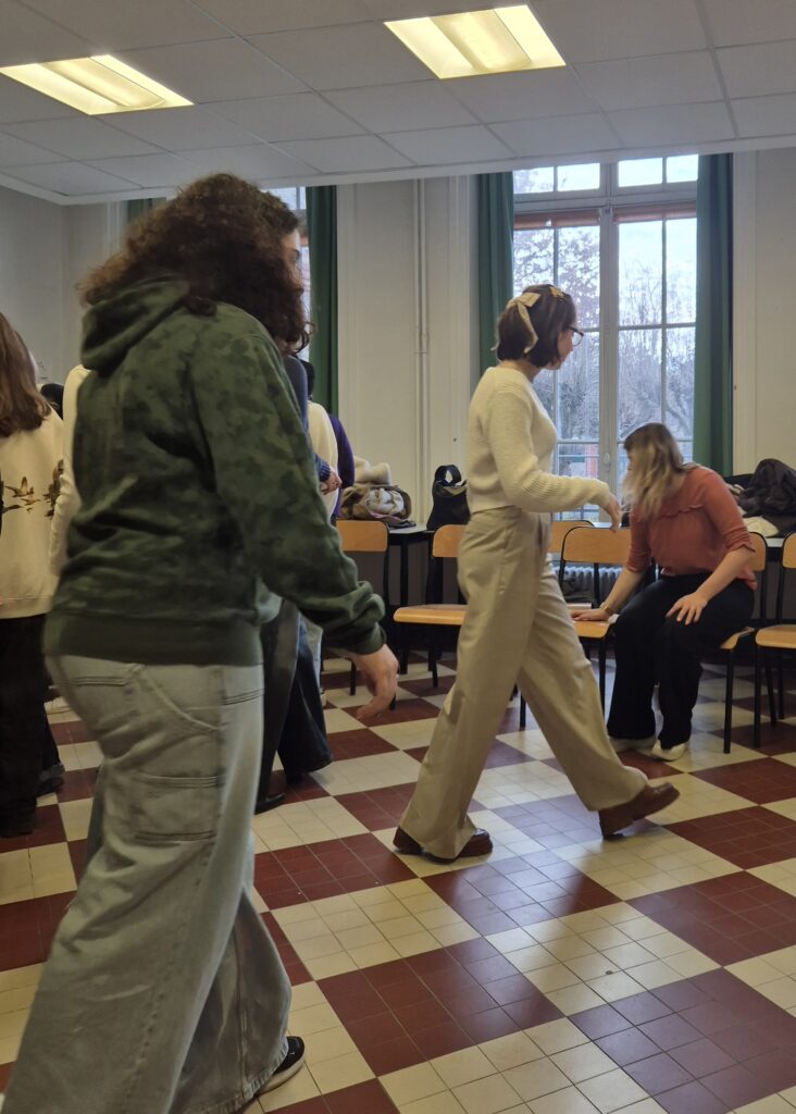 Ensuite, nous avons dû nous déplacer avec les niveaux de tension qu’elle nous imposait. Enfin, nous nous sommes assis de nouveau en formant un rond pour faire le dernier exercice. Il y avait une chaise en face, à tour de rôle, il fallait choisir un niveau de tension et se déplacer jusqu’à la chaise, s’y asseoir et revenir à sa place, tout en restant dans le niveau de tension que nous avions choisi.