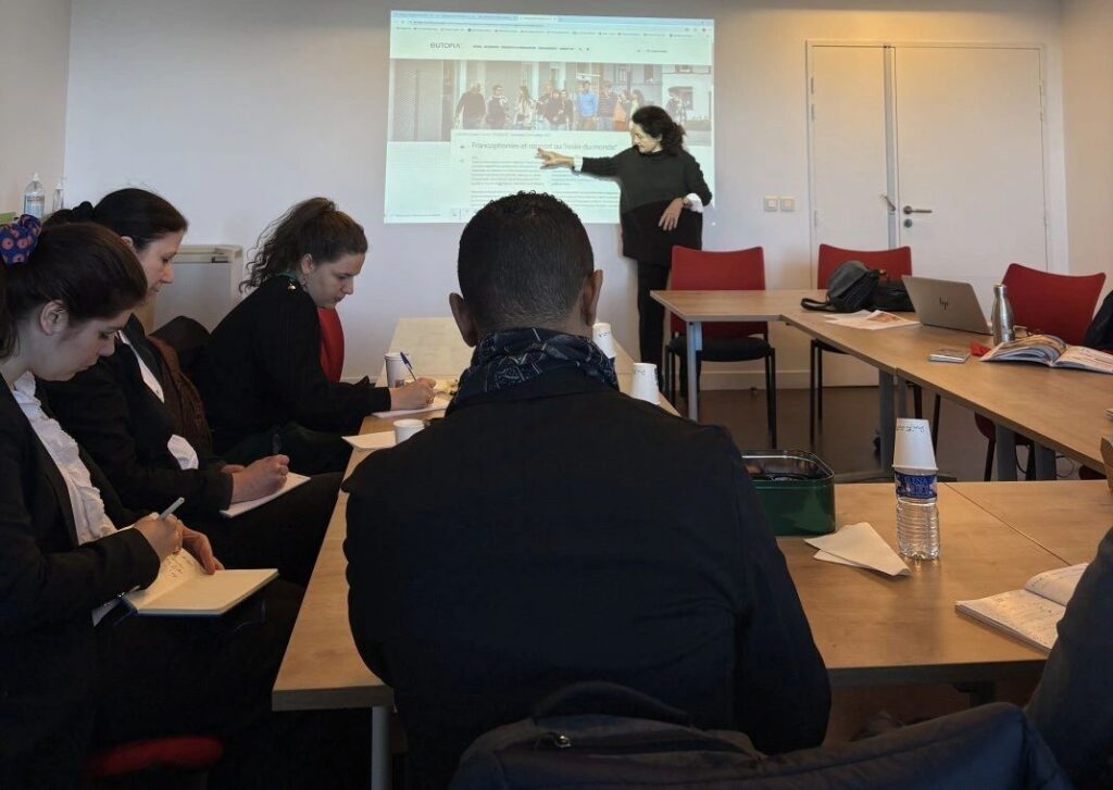 Florence BRAY, chargée de mission pour les relations internationales, a présenté différents supports de coopération possibles dans le domaine du français langue étrangère, dont en particulier un master en ligne, Former et intégrer par la langue, et une communauté connectée «FrancophonieS» qu’elle coordonne dans le cadre de l’alliance universitaire Eutopia.