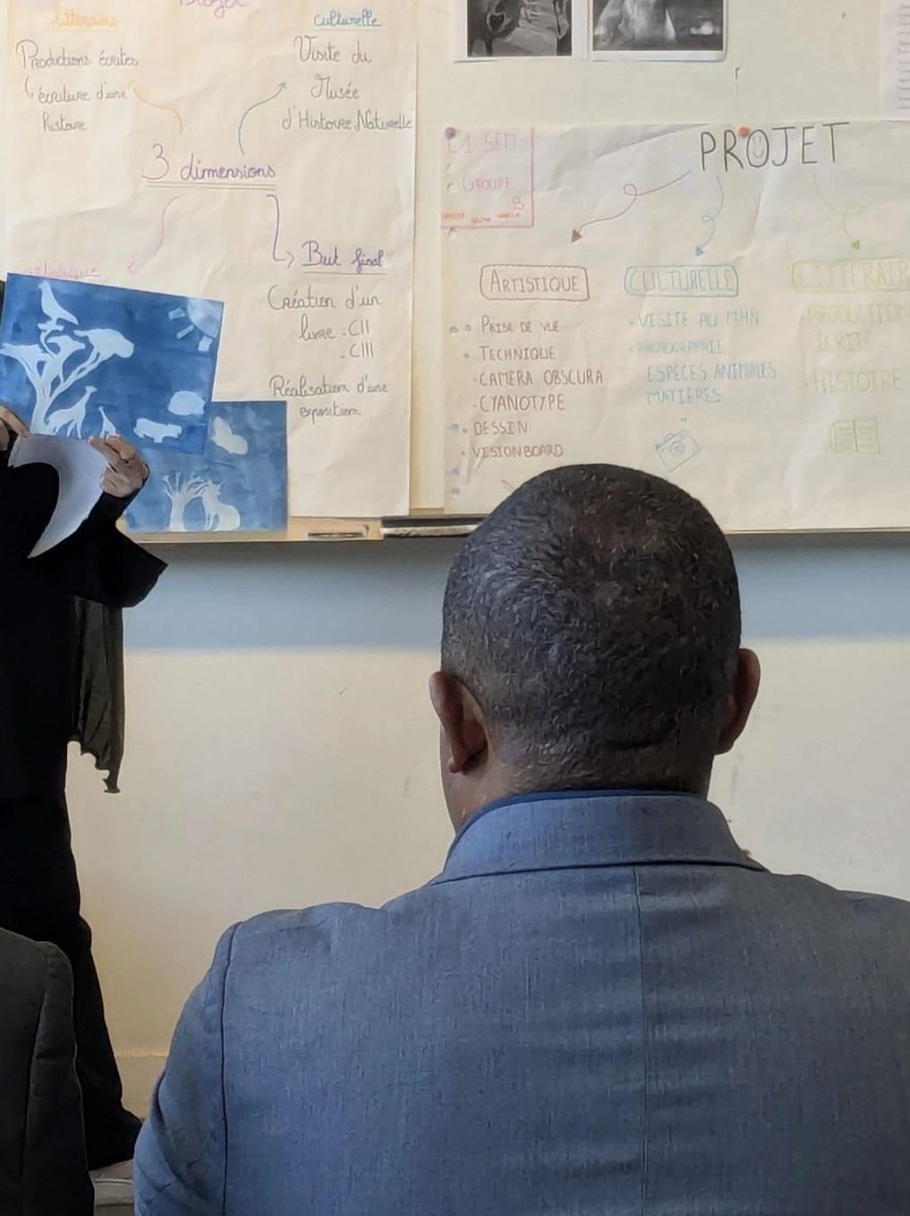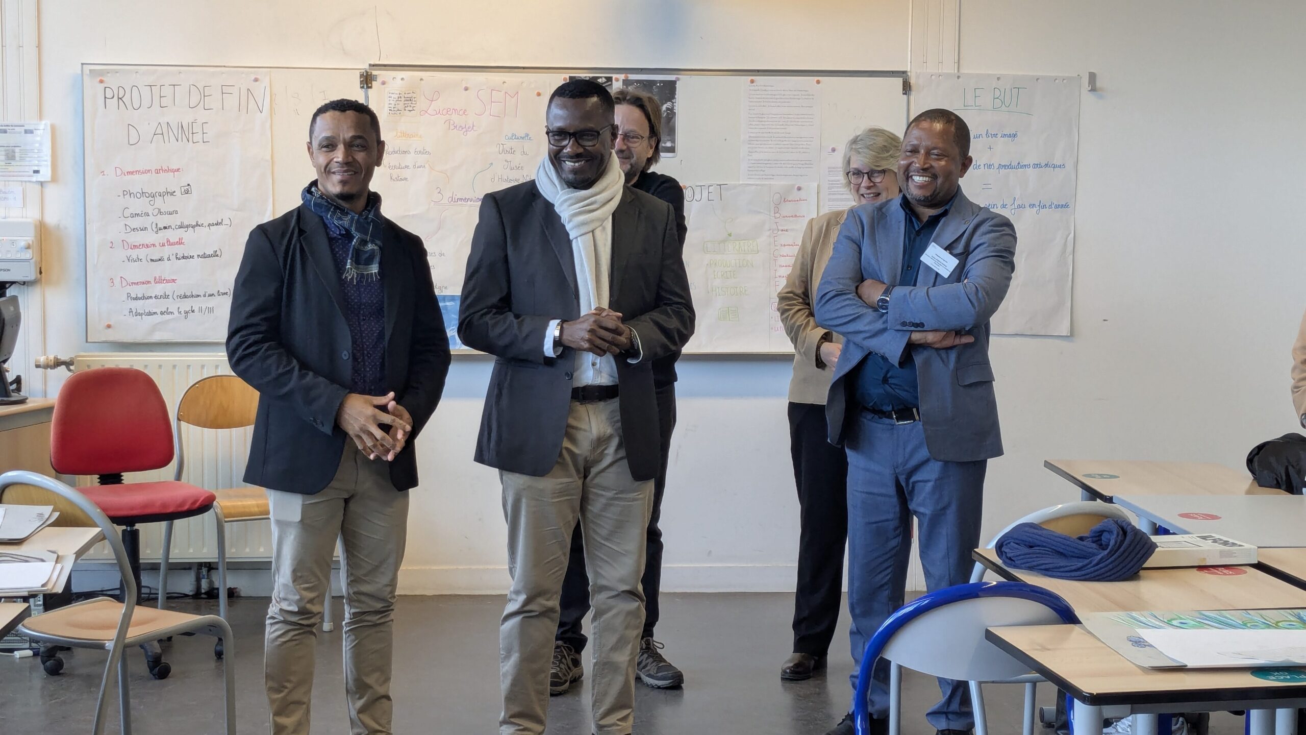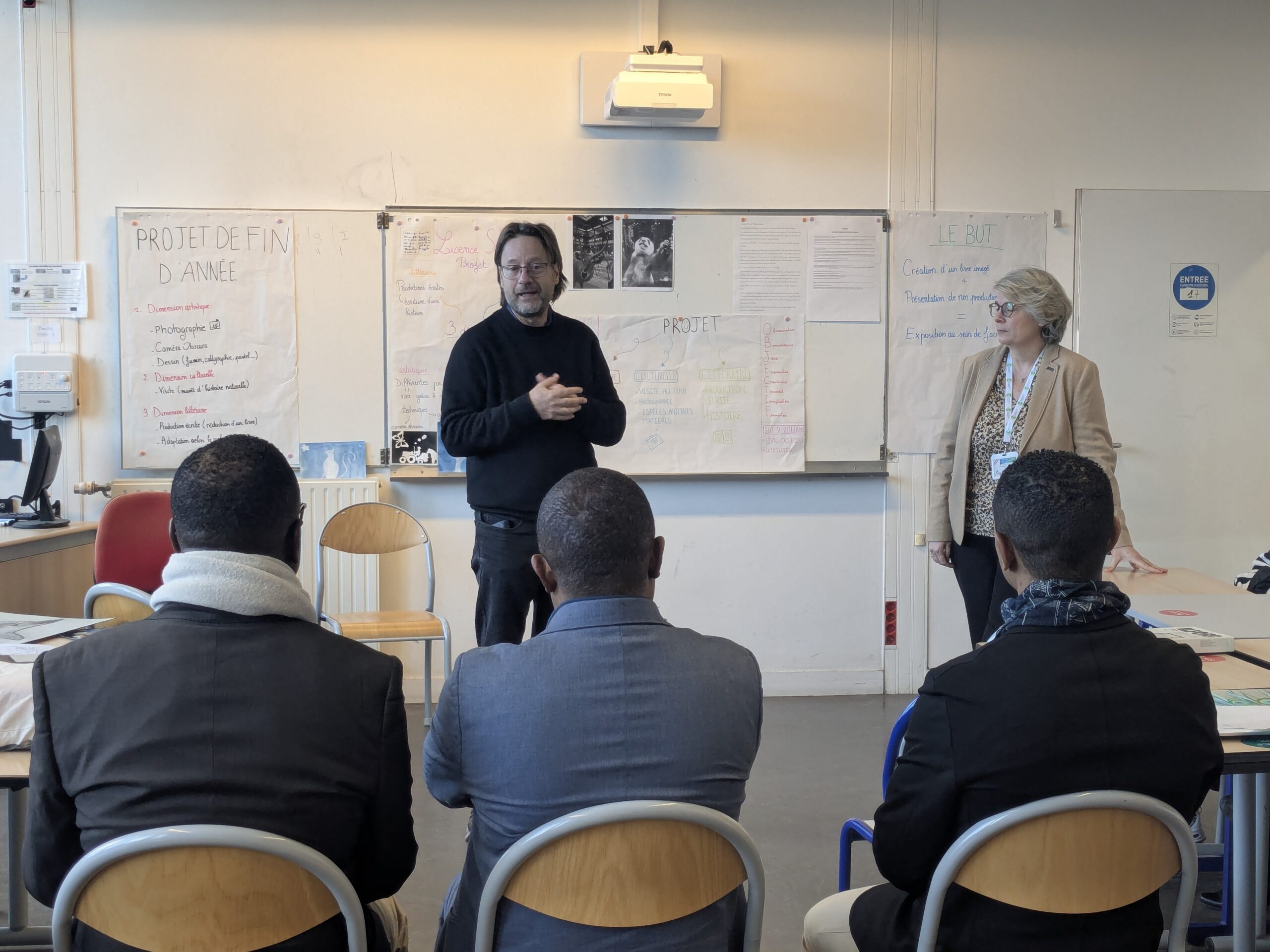 Le groupe de Licence 2 Sciences Enseignement Médiation, accompagnés par leurs responsables de formation Claire Renvoisé et Philippe Roiné, a accueilli la délégation avec enthousiasme. Quelques étudiants ont présenté les restitutions des projets culturels élaborés plus tôt dans l’année. Ces projets d’Éducation Artistique et Culturelle visaient à inclure plusieurs dimensions :